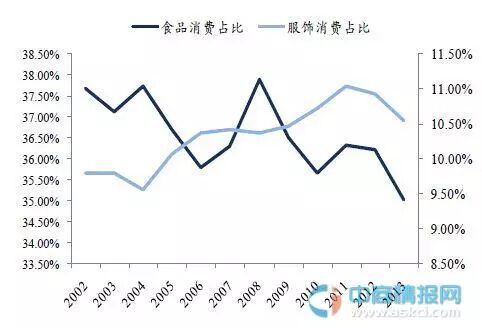 国民生活水平持续提升,黄金珠宝需求旺盛。在中国经济持续快速增长和人均可支配收入水平不断提高的背景下,人们在满足基本生活需求的基础上,逐渐增加了对珠宝饰品的消费,黄金珠宝饰品消费成为继住房、汽车之后居民的第三大消费热点。2014年我国人均可支配收入已达28844元,过去五年复合增速达10%;“十二五”规划明确提出城镇居民人均可支配收入和农村居民人均纯收入分别年均增长7%以上的目标。同时,随着国民收入绝对值的提升,食品消费占消费性支出的比重逐渐下降,服饰、娱乐休闲等支出占比长期呈上升趋势。随着人均可支配收入不断提升,消费升级持续深化,黄金珠宝行业维持高速增长可期。
